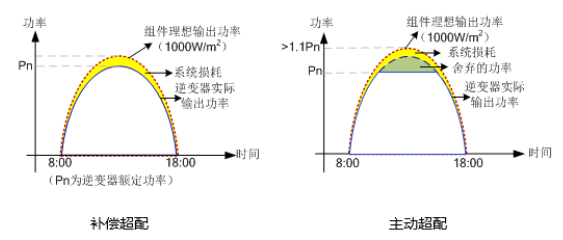 上圖所示,在主動超配的情況下,由于受到逆變器額定功率的影響,在組件實際功率高于逆變器額定功率的時段內,系統(tǒng)將以逆變器額定功率工作;在組件實際功率小于逆變器額定功率的時段內,系統(tǒng)將以組件實際功率工作。